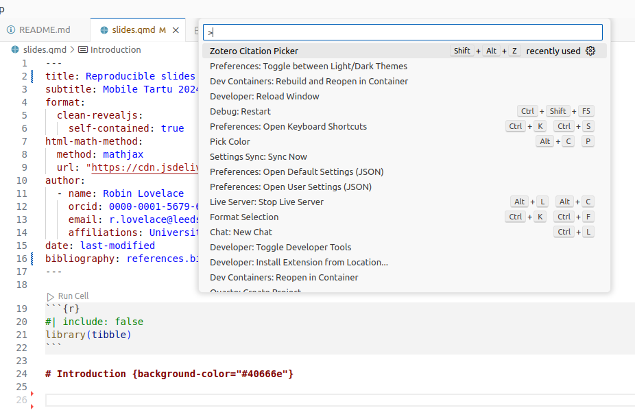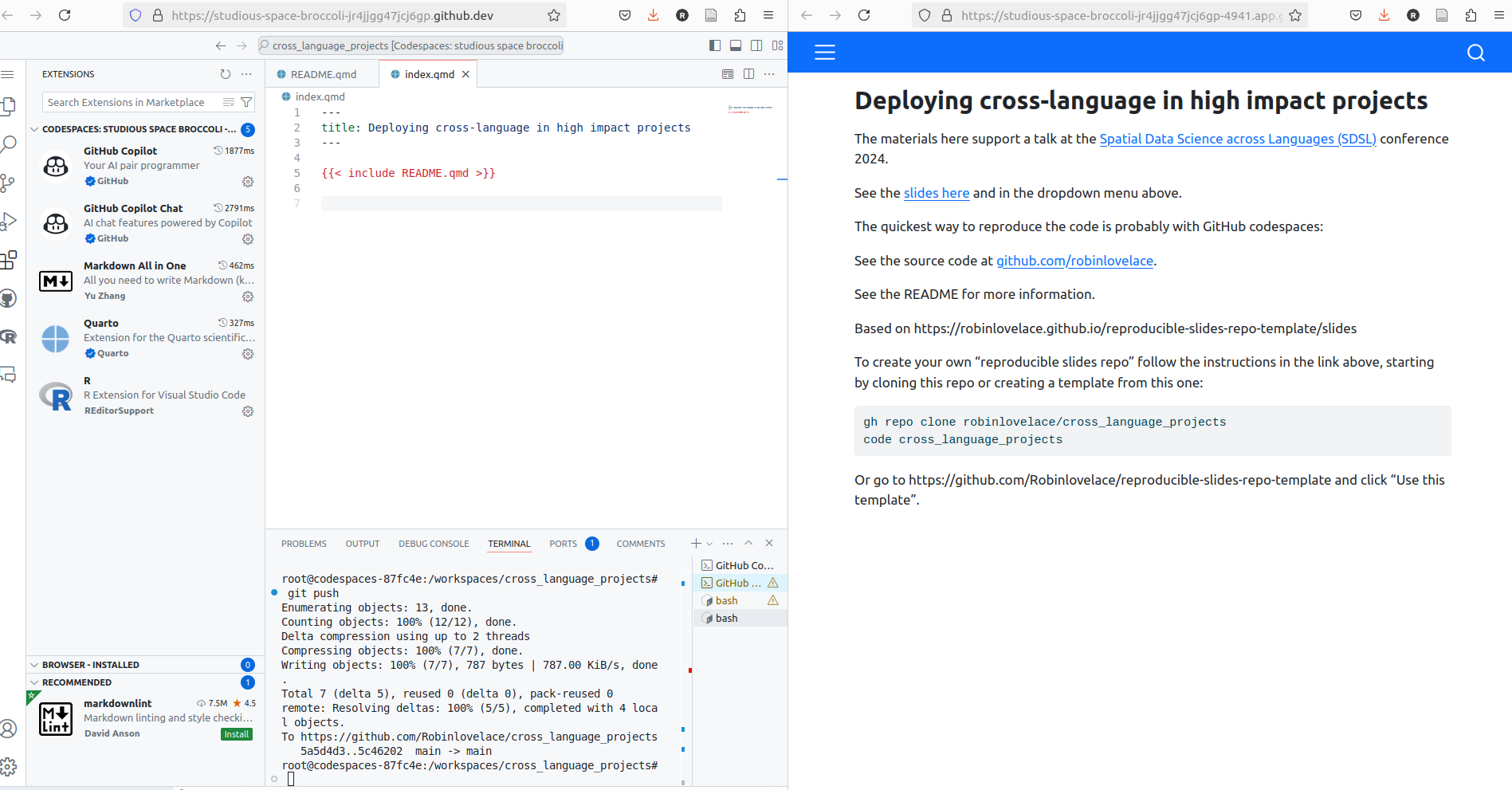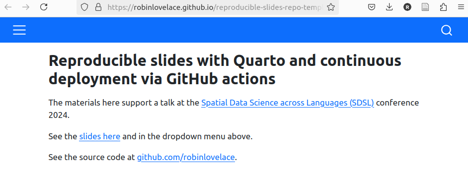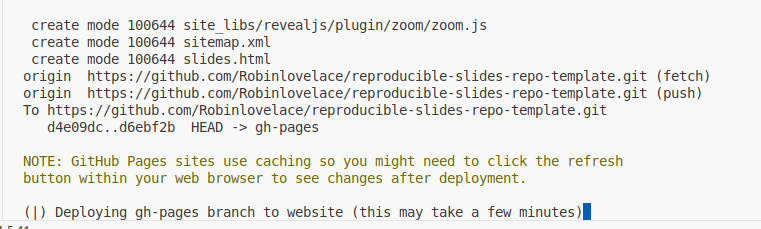The previous command creates a gh-pages branch with the slides in the docs folder. This is then automatically deployed to GitHub Pages, and the website is opened in your browser when ready: